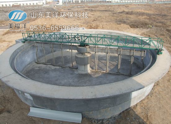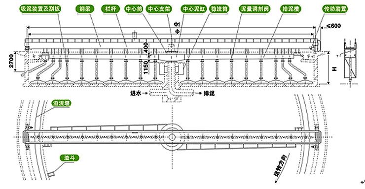 通過減速驅(qū)動和懸掛式組件的傳動,由刮板將污泥刮集到中心集泥槽,依靠靜水壓力或泵排出池外。采用中間進(jìn)水和排泥,周邊排水,保證水流均勻。利用液位差自吸式排泥,有浮渣刮集排除裝置和過載保護(hù)裝置。