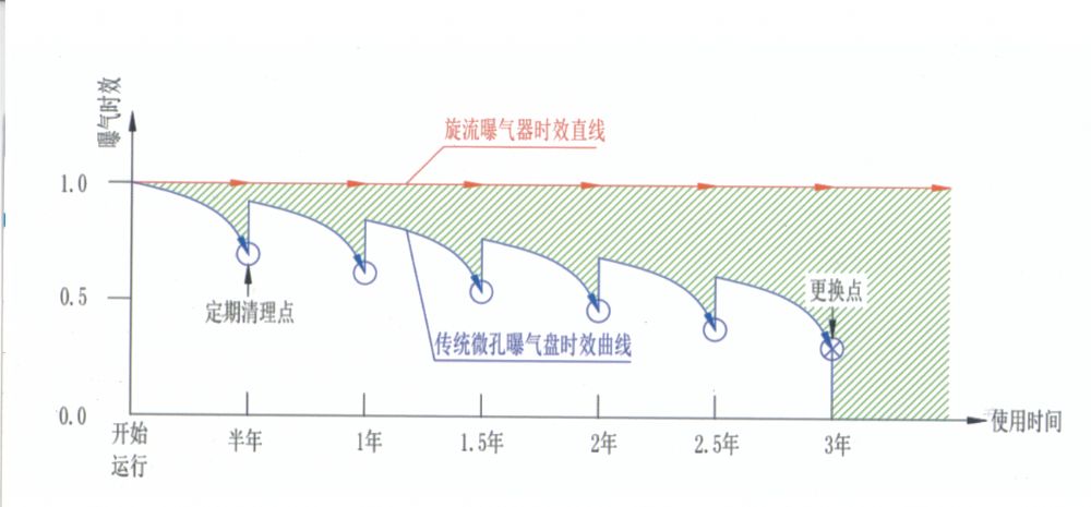 從上圖可以看出,旋流式曝氣器在污水中曝氣效率始終不變,而傳統(tǒng)微孔曝氣隨著使用時間的延長,其曝氣效率是遞減的,而且到達使用年限必須更換。