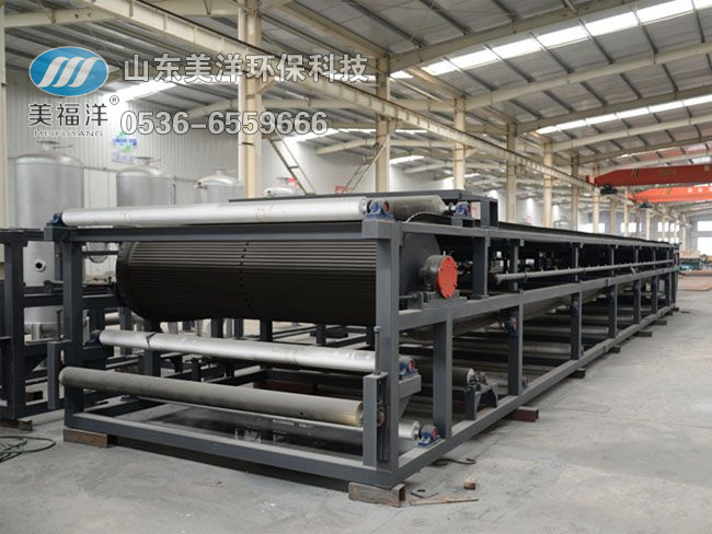 真空過濾機(jī)是以真空負(fù)壓為推動(dòng)力實(shí)現(xiàn)固液分離的設(shè)備,在結(jié)構(gòu)上,過濾區(qū)段沿水平長度方向布置,可以連續(xù)完成過濾、洗滌、吸干、濾布再生等作業(yè)。橡膠帶式過濾機(jī)具有過濾效率高、生產(chǎn)能力大、洗滌效果好、濾餅水分低、操作靈活,維修費(fèi)用低等優(yōu)點(diǎn)。橡膠帶式過濾機(jī)可廣泛應(yīng)用于冶金、礦山、化工、造紙、食品、制藥、環(huán)保等領(lǐng)域中的固液分離,尤其在煙氣脫硫中的石膏脫水方面( FGD )有良好的應(yīng)用。