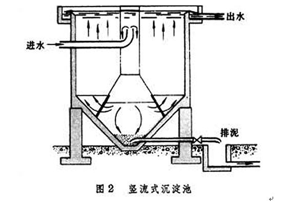 豎流式沉淀池又稱立式沉淀池,是池中廢水豎向流動的沉淀池。池體平面圖形為圓形或方形,水由設(shè)在池中心的進(jìn)水管自上而下進(jìn)入池內(nèi)(管中流速應(yīng)小于30mm/s),管下設(shè)傘形擋板使廢水在池中均勻分布后沿整個過水?dāng)嗝婢徛仙?對于生活污水一般為0.5-0.7mm/s,沉淀時間采用1-1.5h),懸浮物沉降進(jìn)入池底錐形沉泥斗中,澄清水從池四周沿周邊溢流堰流出。
